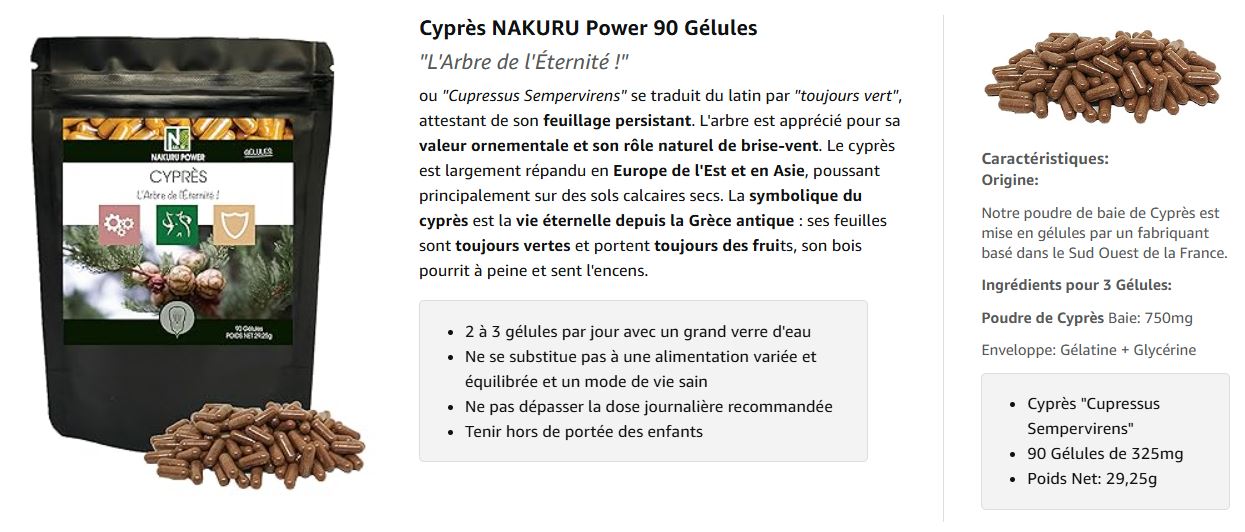 J’ai intégré ce complément à ma routine et je me sens plus en forme. Le cyprès semble vraiment aider à protéger mon corps des petits coups de fatigue, et je suis fan de son histoire liée à l’éternité."
