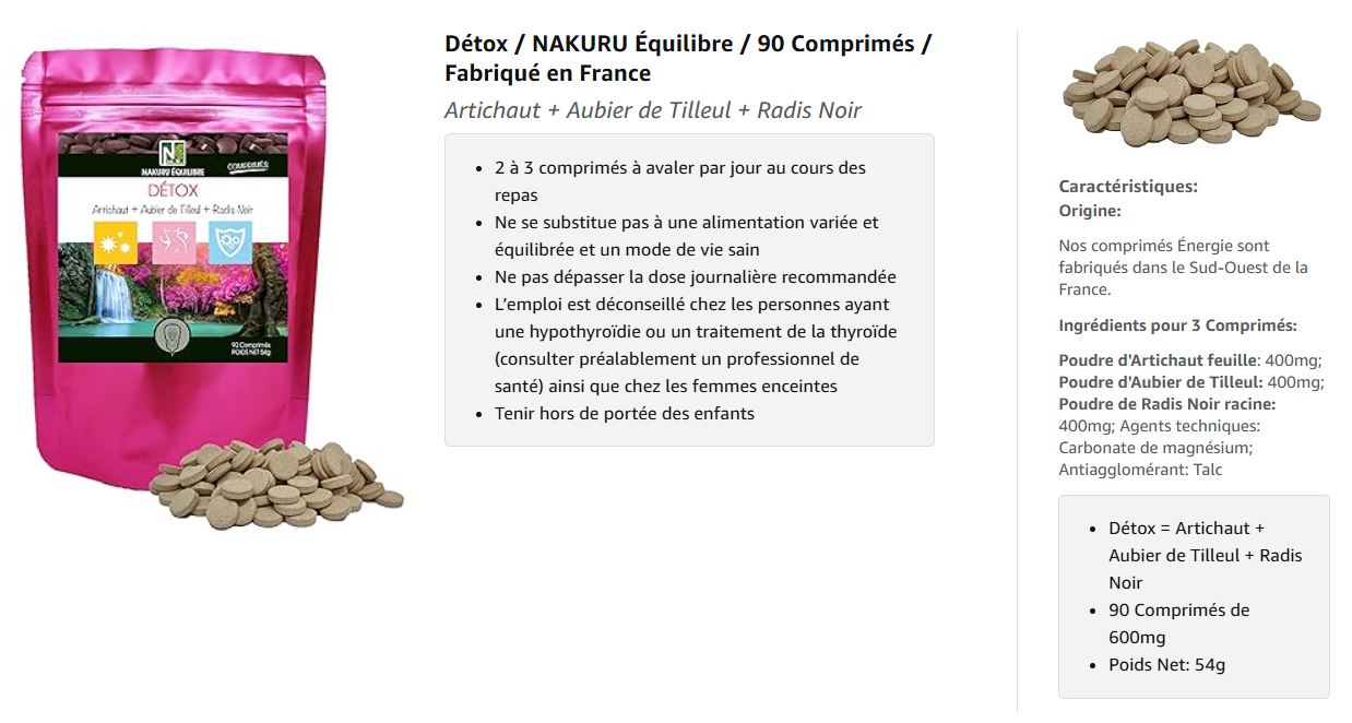 NAKURU Détox contient un mélange naturel d’artichaut (feuille), d’aubier de tilleul et de radis noir (racine), avec 400 mg de chaque par 3 comprimés, complété par des agents comme le carbonate de magnésium et le talc.