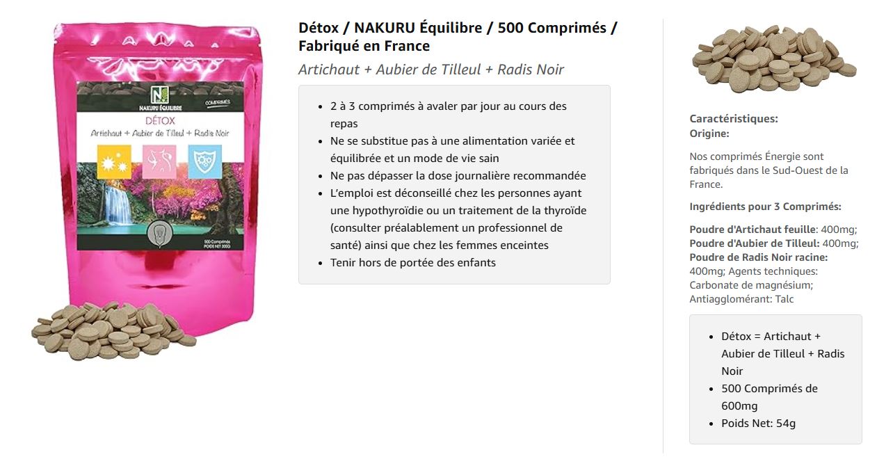 NAKURU Détox contient un mélange naturel d’artichaut (feuille), d’aubier de tilleul et de radis noir (racine), avec 400 mg de chaque par 3 comprimés, complété par des agents comme le carbonate de magnésium et le talc.
