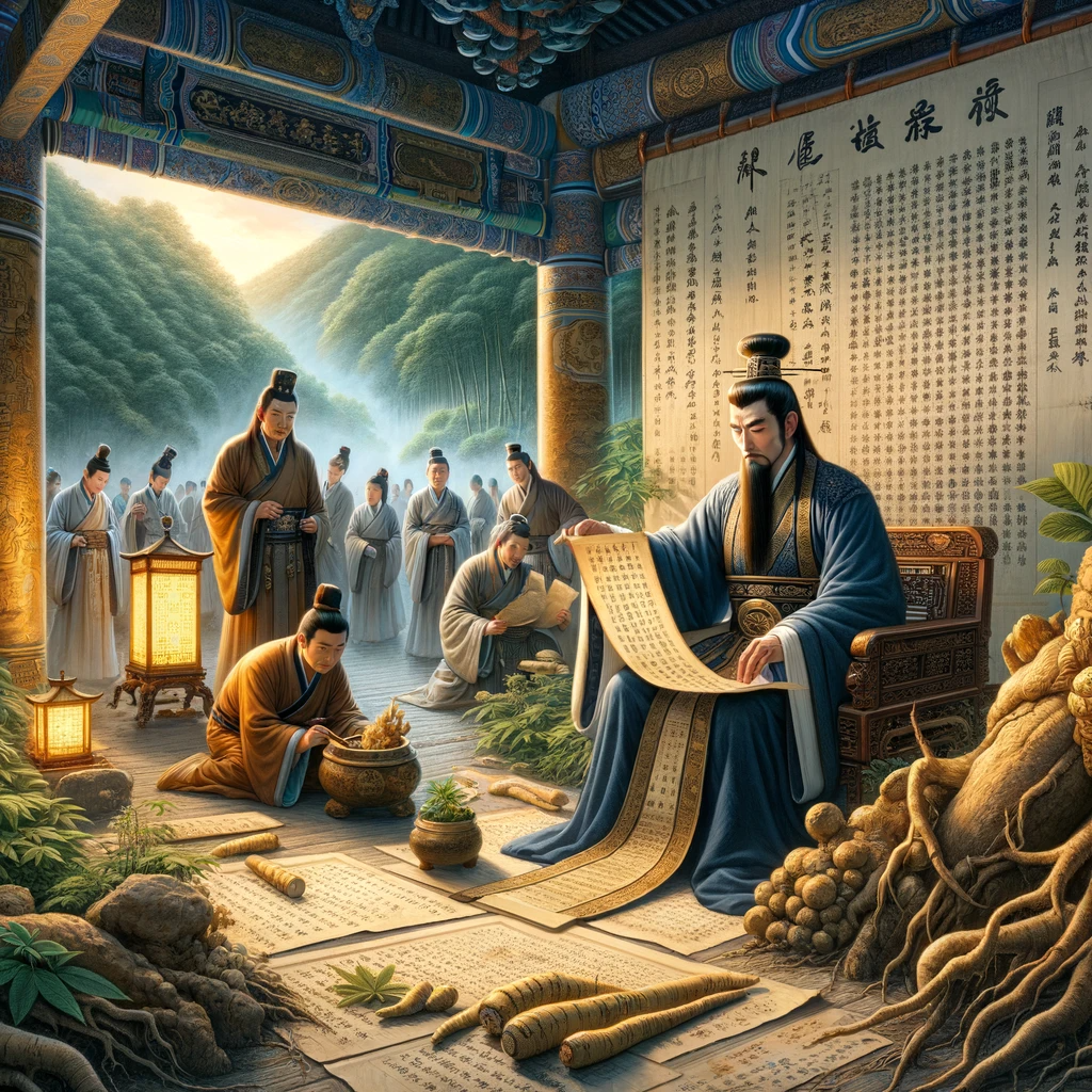 L'utilisation médicinale du ginseng était encore mentionnée dans les anciens traités des herbes médicales de la Pharmacopée Chinoise écrit par l'empereur Shen Nong vers 2700 av. J.C, dans lequel la racine de ginseng faisait partie des produits liés à l'augmentation de la longévité.