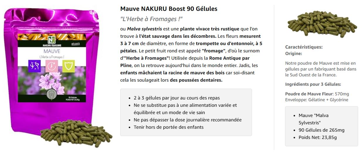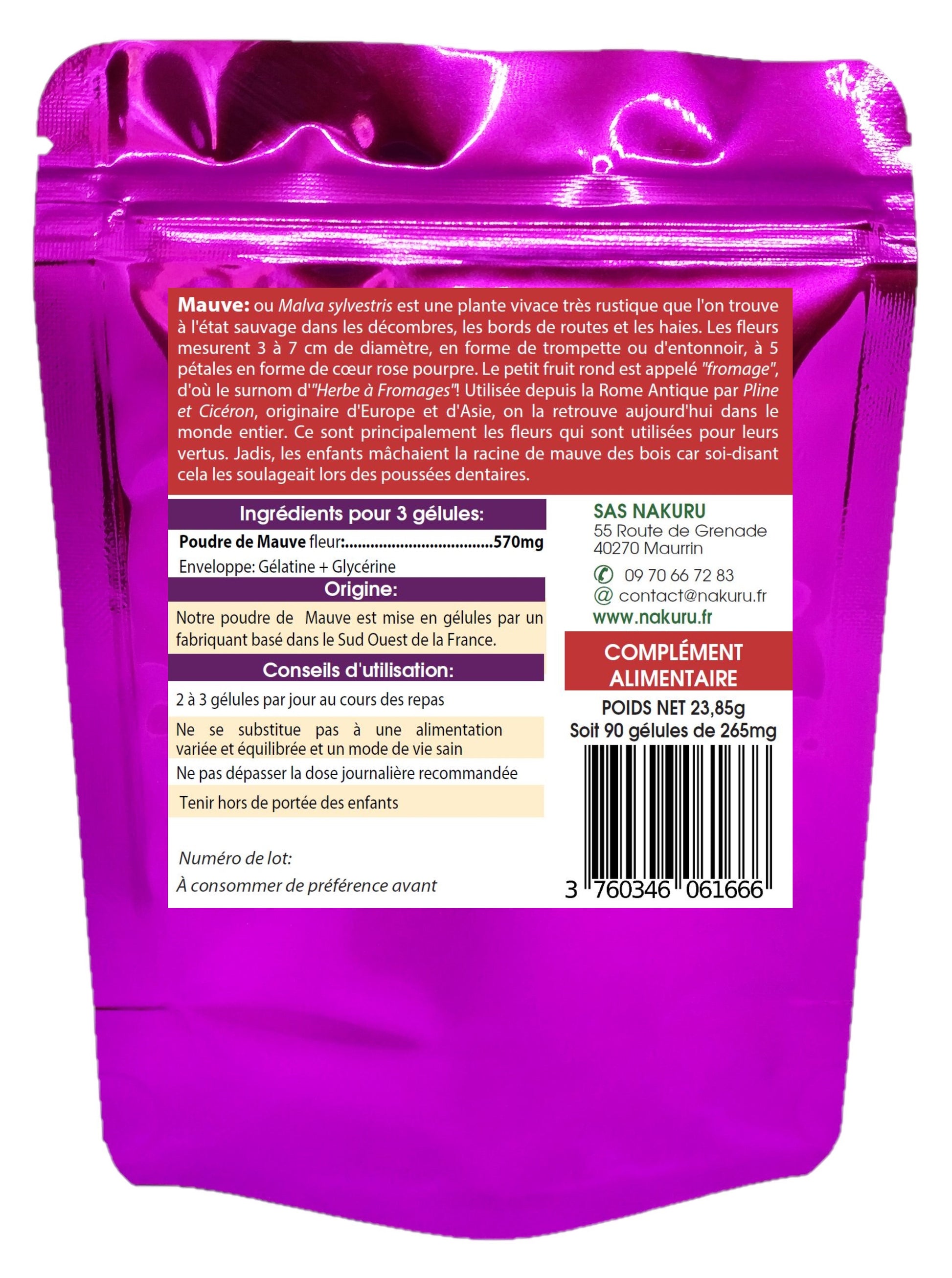 La gélule contient de la poudre de fleurs de Mauve, et son enveloppe est composée de gélatine et glycérine. Le tout est conditionné dans le Sud-Ouest de la France.