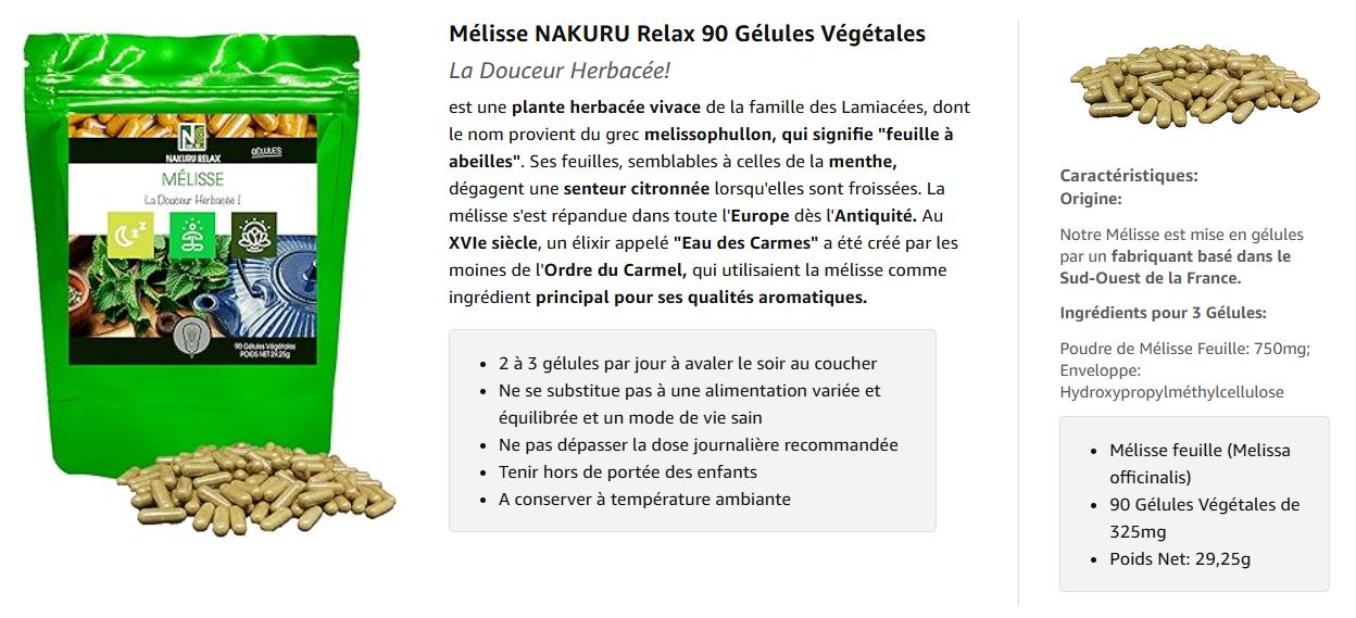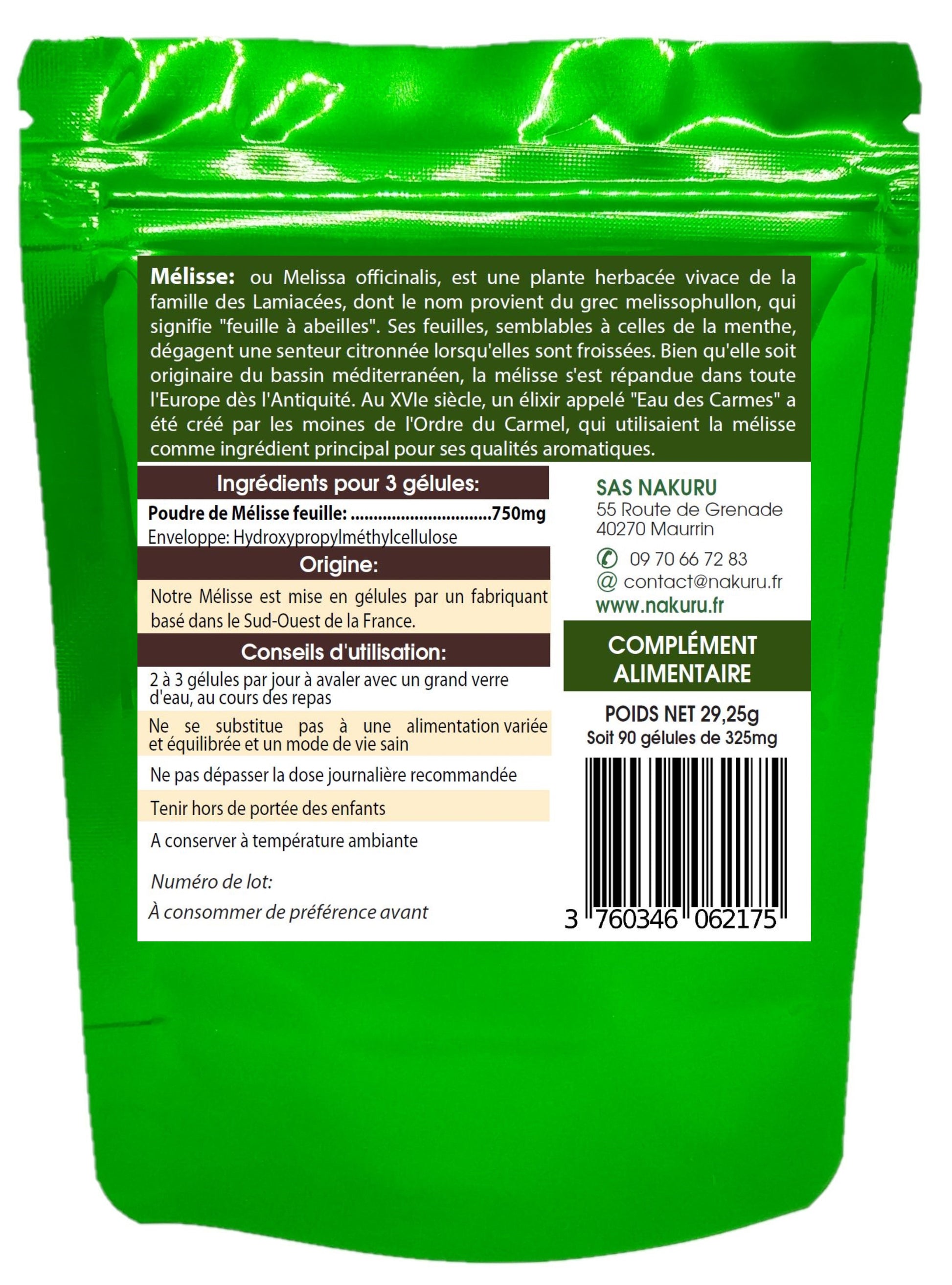 🌱 FORMULE PURE & SIMPLIFIÉE — ZÉRO CHICHI 🌱: Un seul ingrédient : poudre de feuille de Mélisse (750mg pour 3 gélules). Pas d’additifs douteux, pas de bla-bla. Juste l’essentiel, dans une enveloppe végétale propre et douce pour l’organisme.