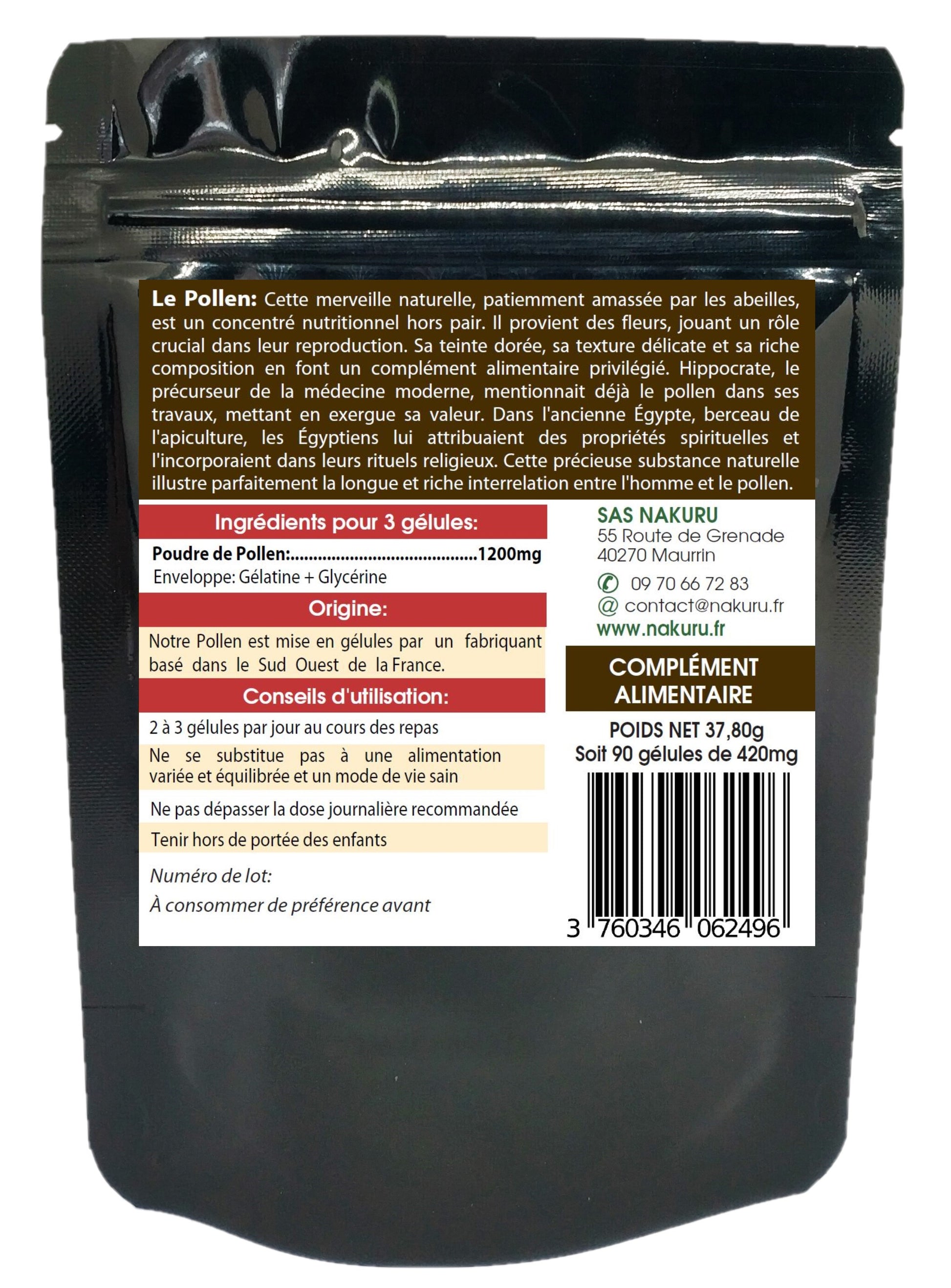 Le pollen est sélectionné avec soin, puis mis en gélules dans le Sud-Ouest de la France, selon des standards de qualité exigeants. L’origine multi-fleurs apporte une grande richesse nutritionnelle naturelle.