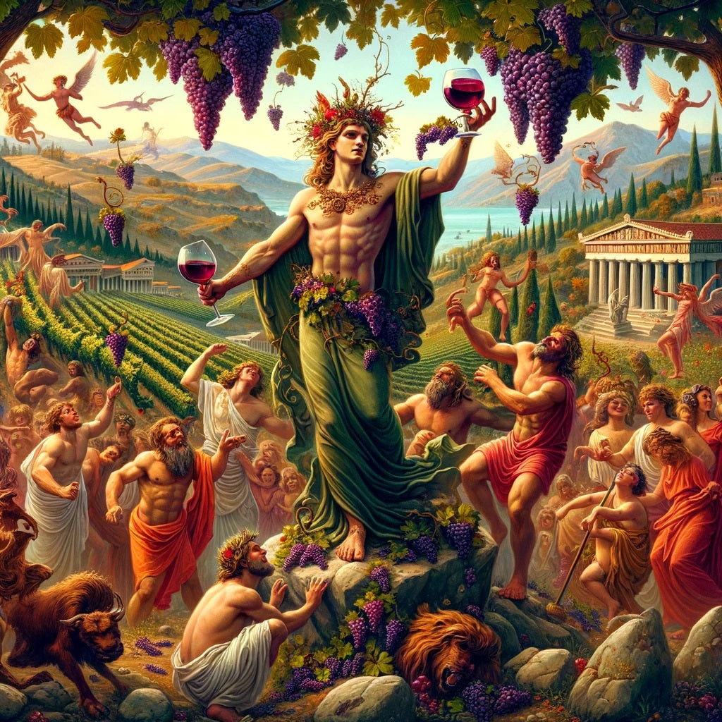 Selon la mythologie grecque, Dionysos avait le pouvoir de transformer n'importe quoi en vin, même les rochers et les arbres. Il était également connu pour sa soif insatiable de vin et ses orgies frénétiques.